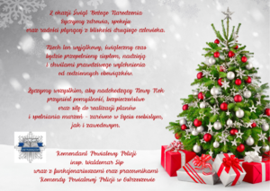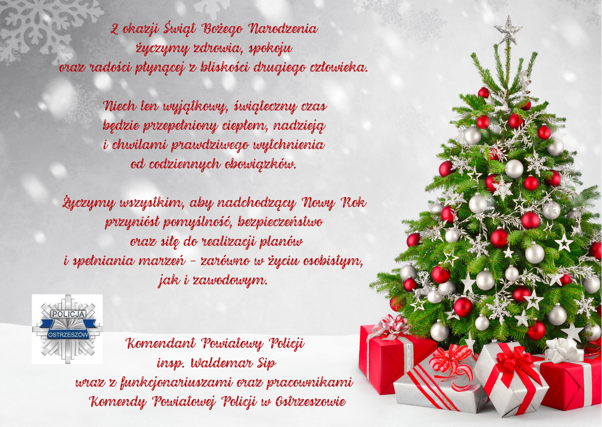 W związku ze zbliżającymi się Świętami Bożego Narodzenia Komendant Powiatowy Policji w Ostrzeszowie - insp. Waldemar Sip, składa serdeczne życzenia wszystkim, którym bliskie są wartości bezpieczeństwa, wzajemnego szacunku i wspólnoty. To wyjątkowy czas refleksji, życzliwości oraz podsumowań, który sprzyja dzieleniu się dobrym słowem i nadzieją na nadchodzący Nowy Rok.